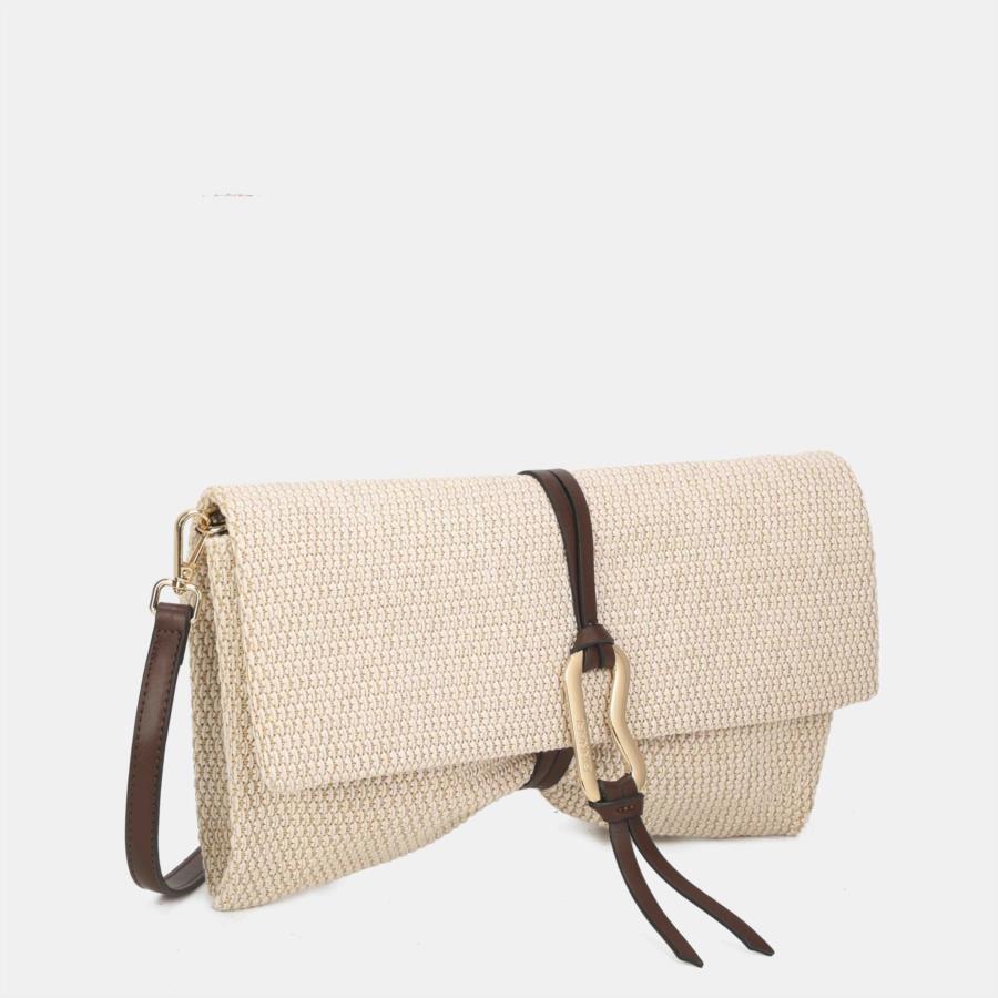 ¡La cartera de mano que sí o sí tienes que tener para esta temporda de Verano! De tamaño mediano y confeccionada en rafia y detalles en pu. Puedes llevarla además de bandolera, ya que tiene un asa ajustable en su interior. Los detalles metálicos son de color oro claro.