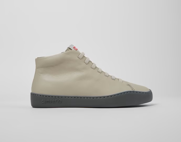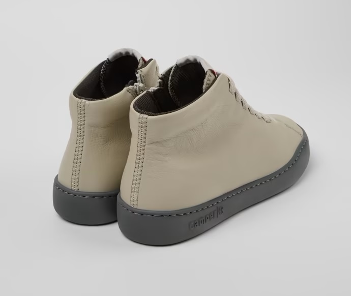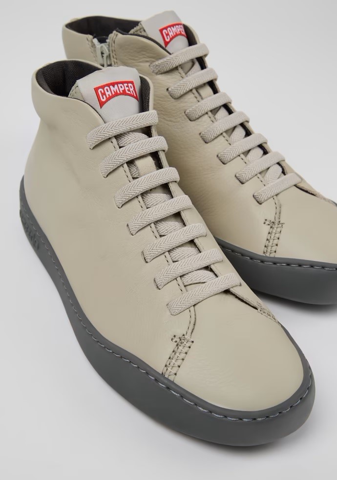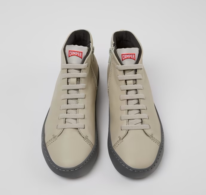 Botines en piel gris para mujer. Empeine 80% PET reciclado con suela exterior de EVA en contraste, plantilla OrthoLite® reciclada y cordones elásticos.