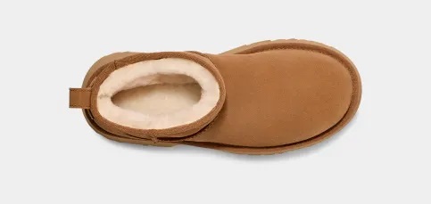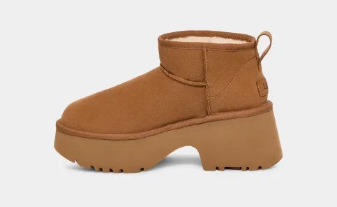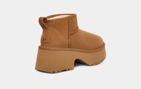 Sube de nivel con las Classic Ultra Mini New Heights Diseñadas con nuestro empeine de ante, forro UGGplush™ y una atrevida caña recortada, estas Classic Ultra Mini se actualizan con una llamativa plataforma robusta con muescas y un tacón de 7,6 cm.