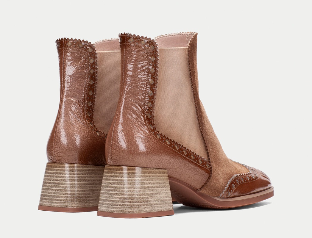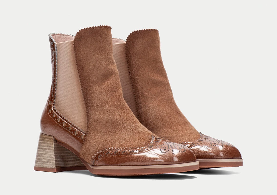 Botín con tacón bloque de 5 cm y punta redonda. Cierre de elásticos en los laterales y detalles troquelados en la parte de la punta. Este incorpora la tecnología Triflow y además cuenta con plantilla extraíble.