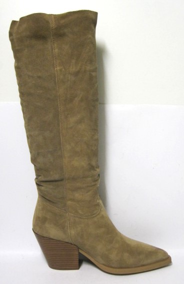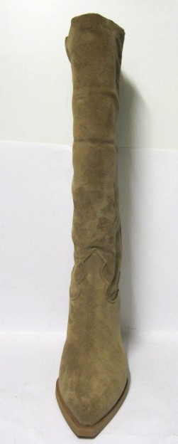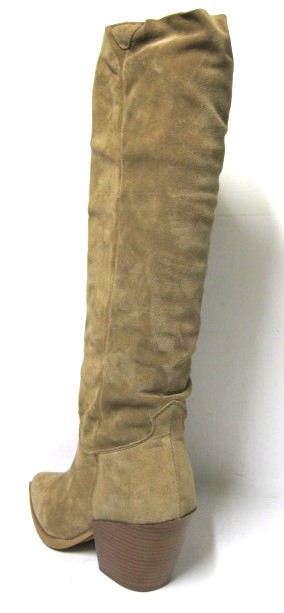 Bota para mujer ALPE VERMONT, fabricada en piel (baby silk) de color camel con tacón de 6,5 cm, suela antideslizante y puntera afilada, sin cierre y caña alta.