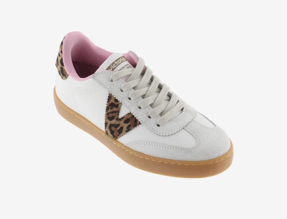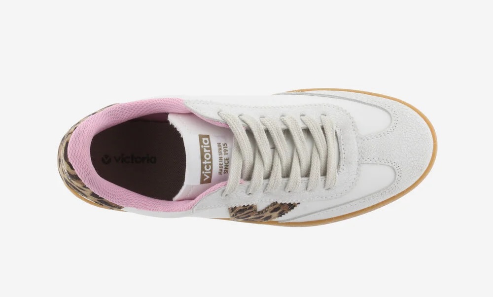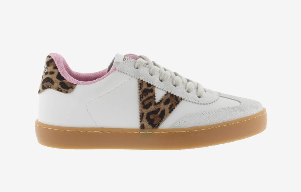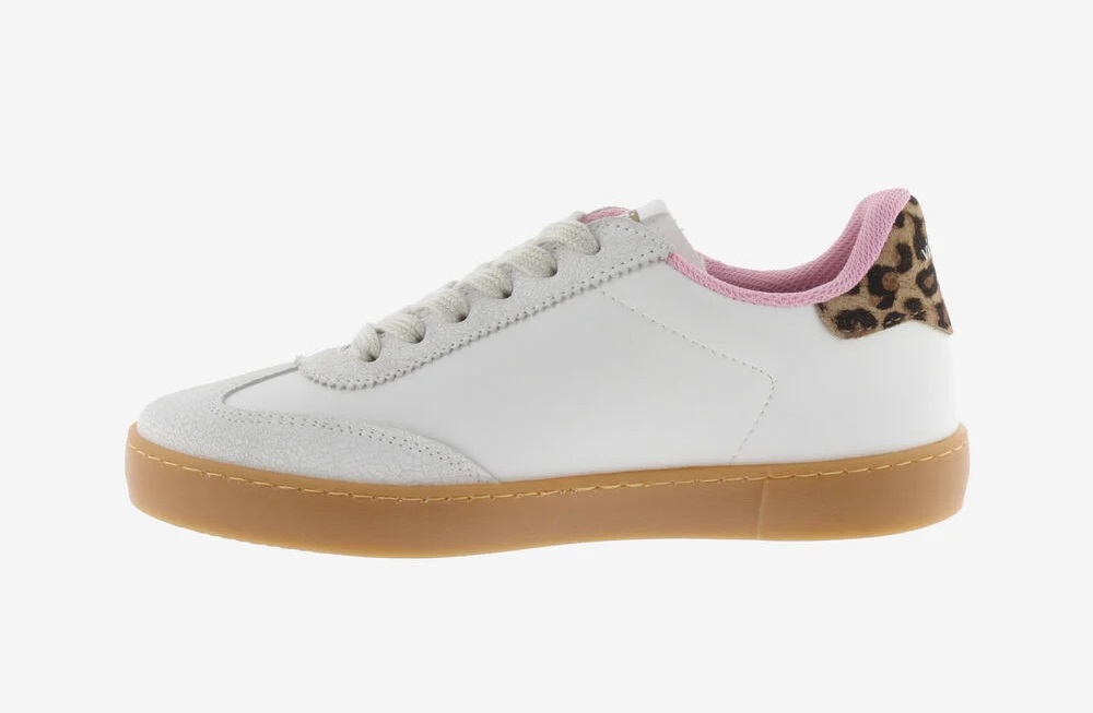 Zapatillas blancas para mujer con estampado leopardo en el logo del lateral y en la trasera. Pieza de serraje de corte ciclista en la puntera y forro interior rosa. Suela traslucida color caramelo aportando un toque de estilo retro. Además, cada par de zapatillas incluye una plantilla más ergonómica, confeccionada a partir de materiales reciclados.