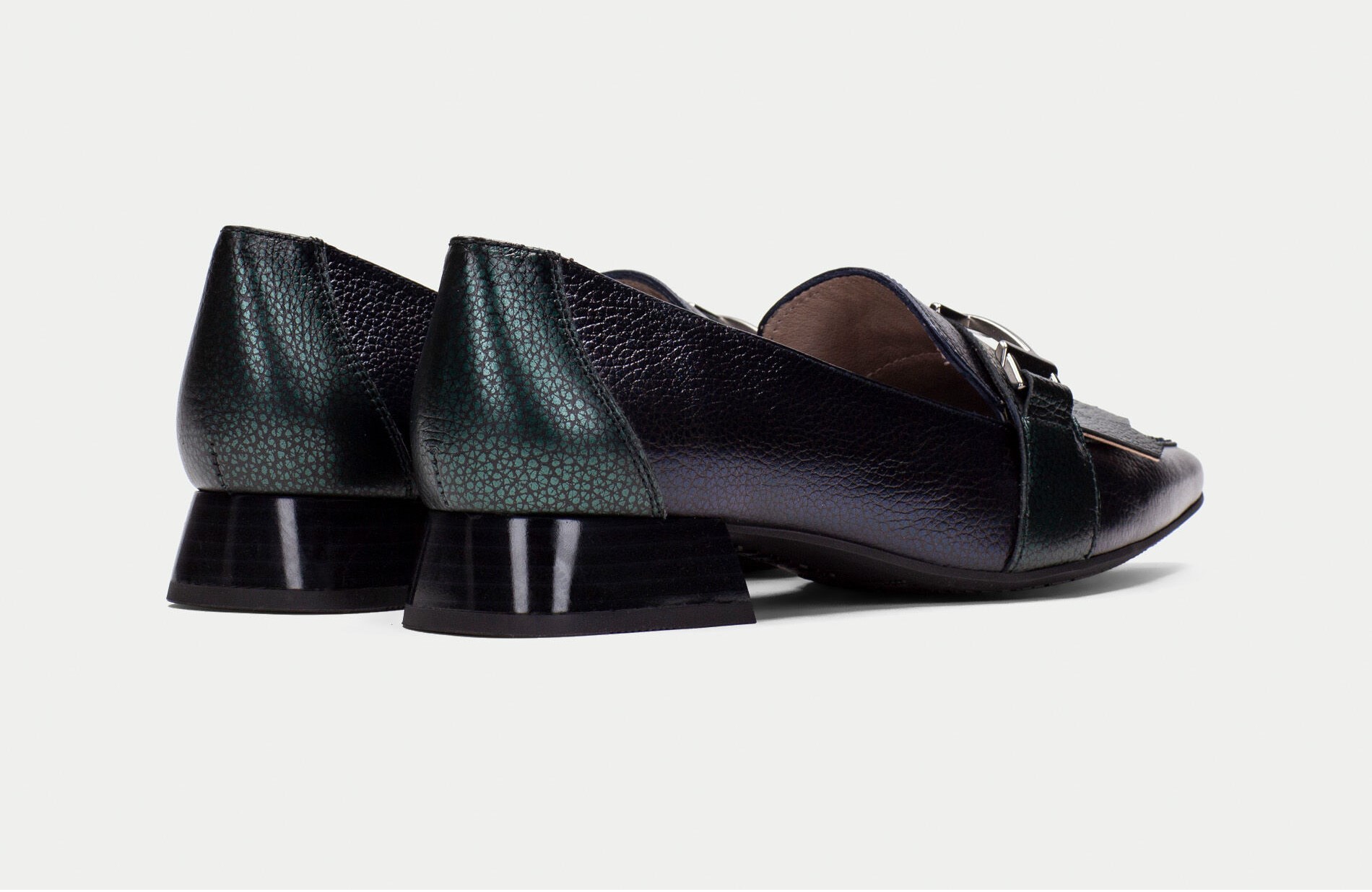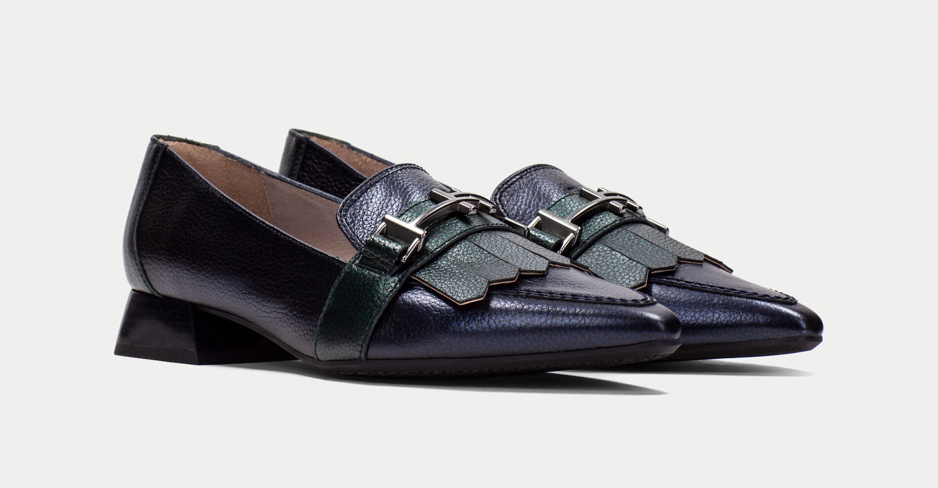 Zapato plano acabado en punta elaborado en piel y tacón de 2,5 cm. Este diseño incorpora el detalle de los flecos y el adorno con la hebilla doble H en la puntera. Este zapato cuenta con la tecnología Triflow, un triple almohadillado que genera un efecto acolchado en la pisada.